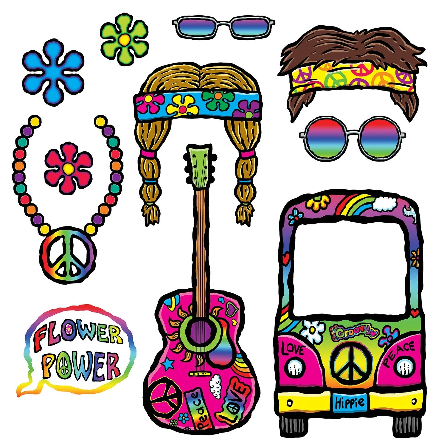 Take groovy selfies and group shots with this assorted 11 pack of iconic 60’s Photo Fun Props, featuring a hippie bus, flower power guitar, peace sign necklace and more. This 60’s photo props come 11 pieces to the pack, which are printed on both sides.
