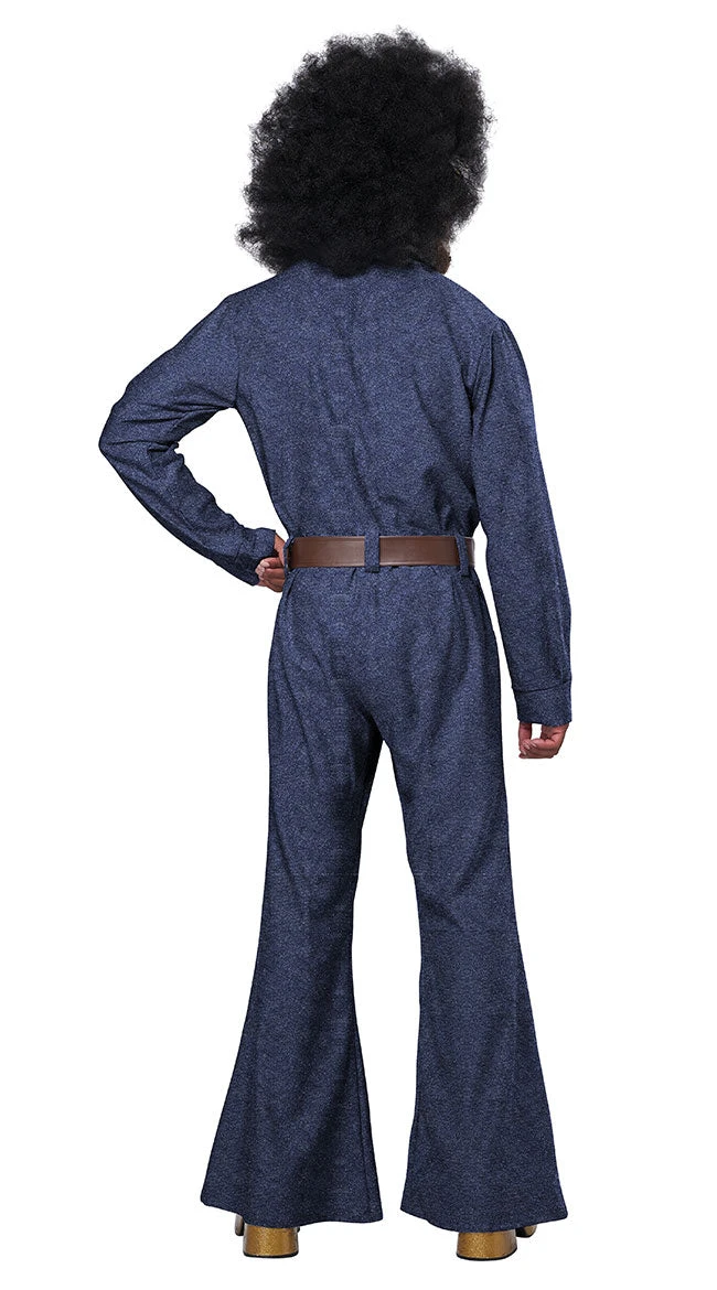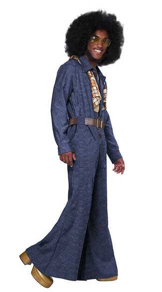 I’ts electric! Boogie on down to funky town in this men’s costume featuring a blue denim look jumpsuit with flared legs, a spread collar with button accents, a neutral geometric print neck tie, and a brown adjustable waist belt with belt loops. (Shoes, necklace and wig not included.)