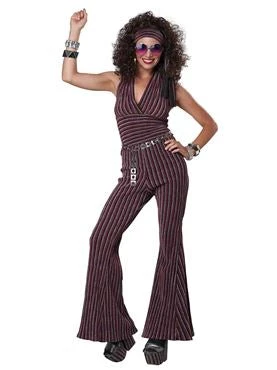 Moving to the beat in a dazzling striped outfit. The 70’s Halter Pant Set comes with a halter top, a pair of bell bottom pants and a head tie. The shimmer fabric is colored in burgundy black and silver stripes.