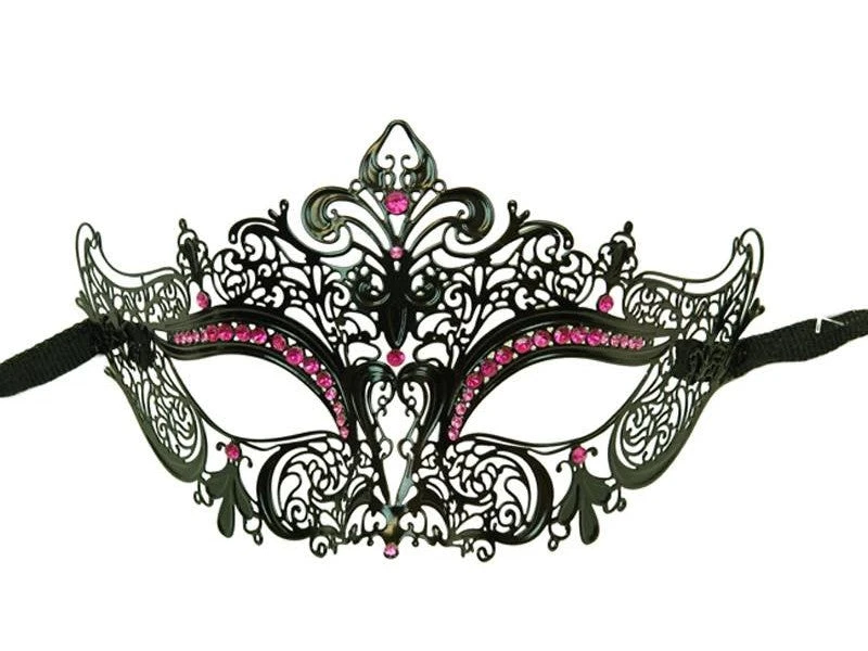 This black laser cut half mask has Purple or Pink crystals for that extra flair! Comfortable one size fit with ribbon closures.