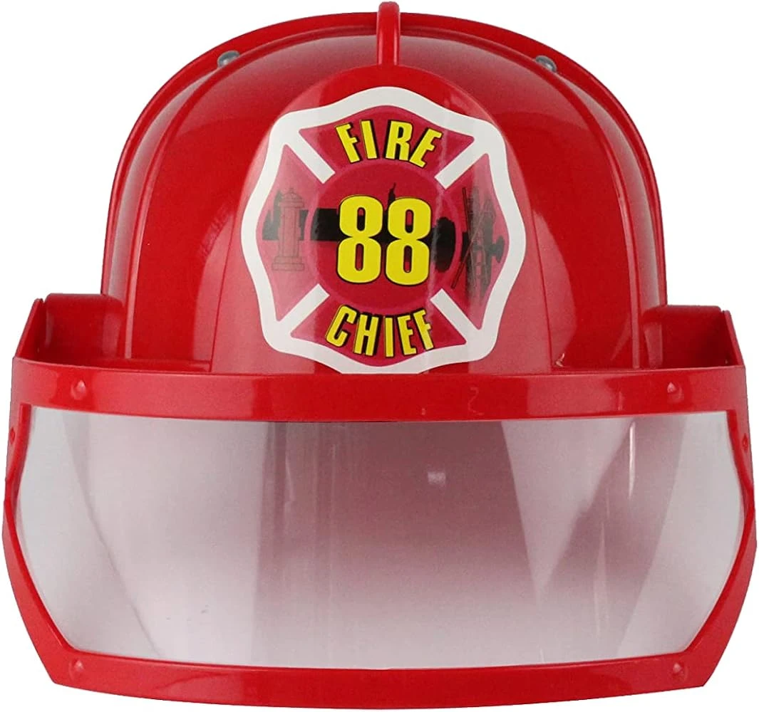 This expertly designed child’s firefighter helmet with eye shield is the perfect gear for any aspiring little hero. Made of red plastic and fitting most children, this helmet will keep them safe while they save the day. A must-have for any young fire fighter.