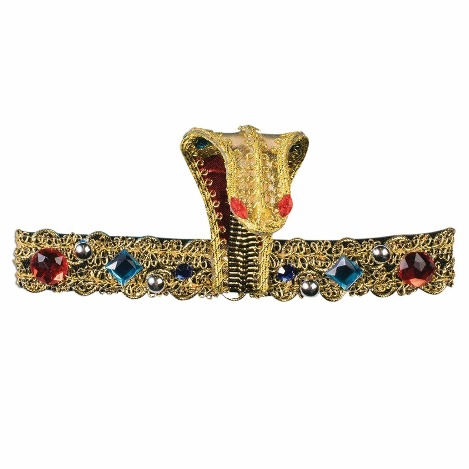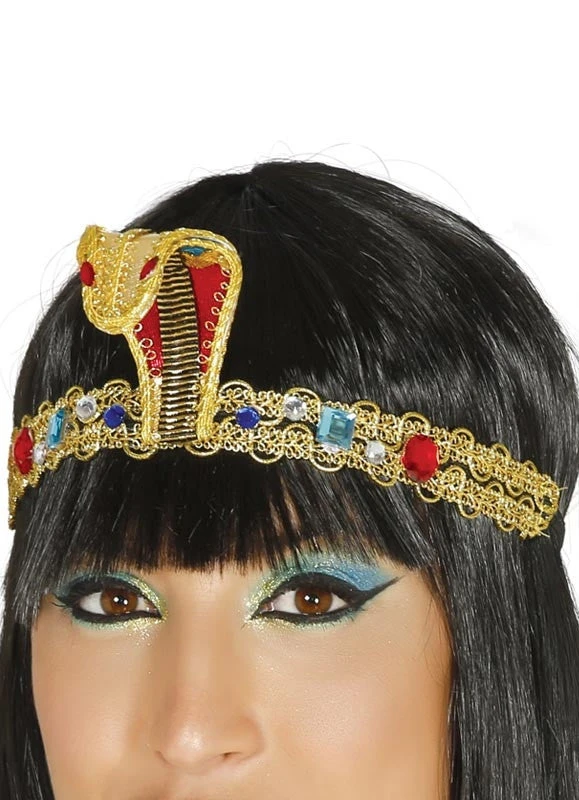 This Egyptian headband is perfect to complete any Cleopatra costume. This elasticated headband sits securely and comfortably on the head. Its exquisite gold detail with coloured gems and a cobra on the front is perfect for any Egyptian Queen.