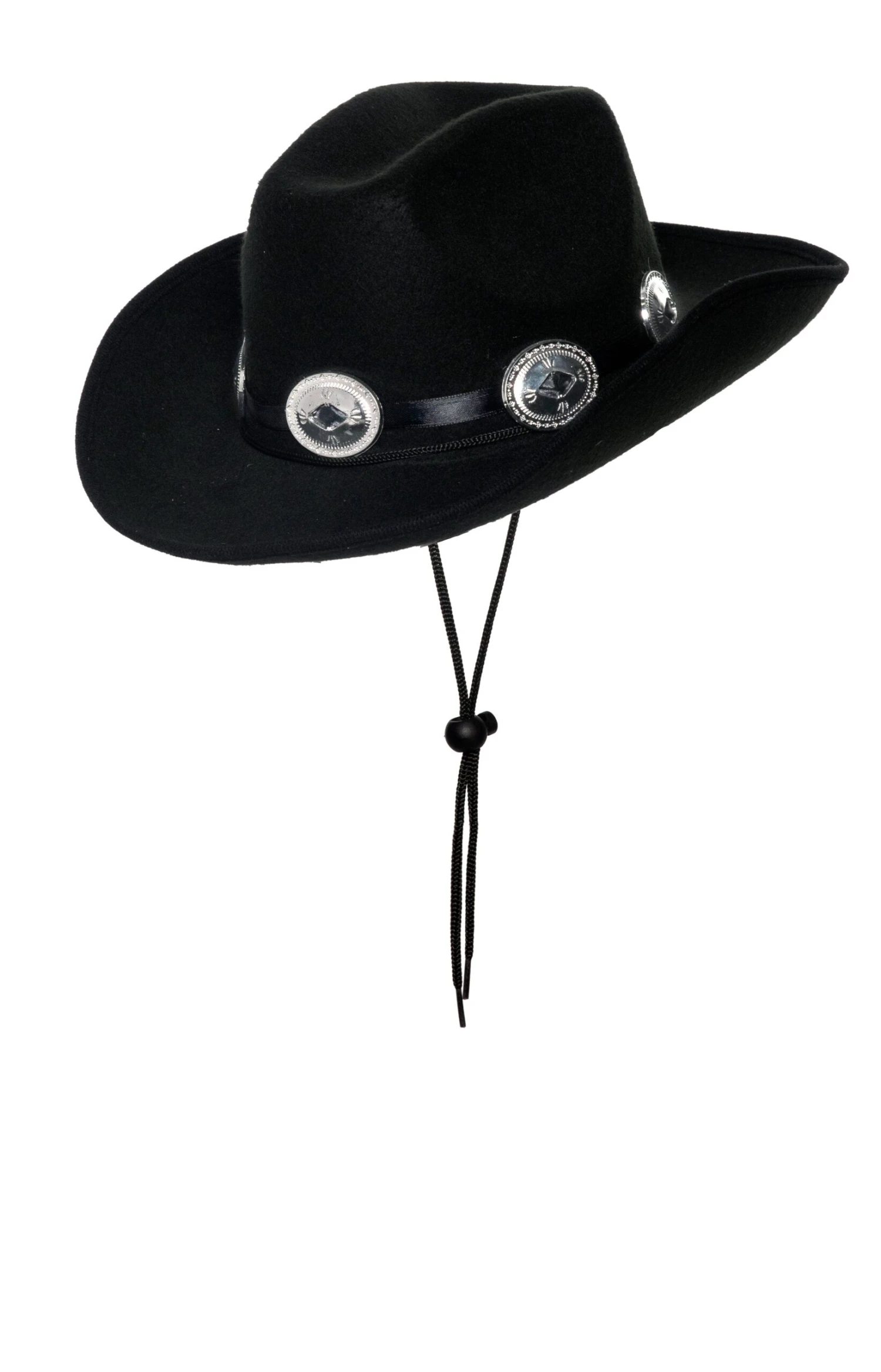 Black cowboy hat with faux leather band and classic silver conch decoration.