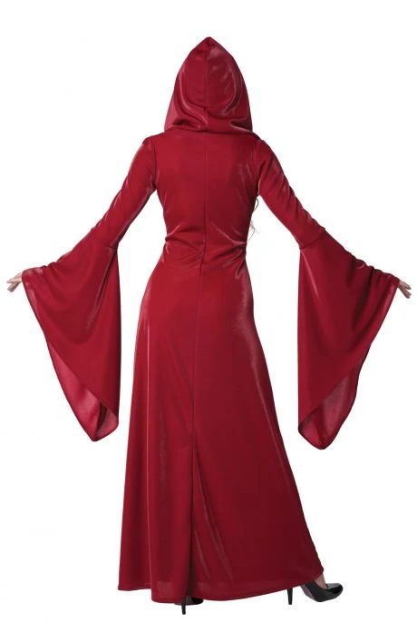 A mysterious robe infused with a radiant red. The women’s Crimson Robe features a lace up front, flared sleeves and an attached hood. Does not include necklace or shoes.