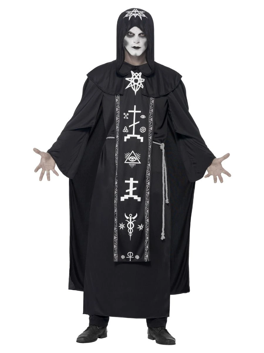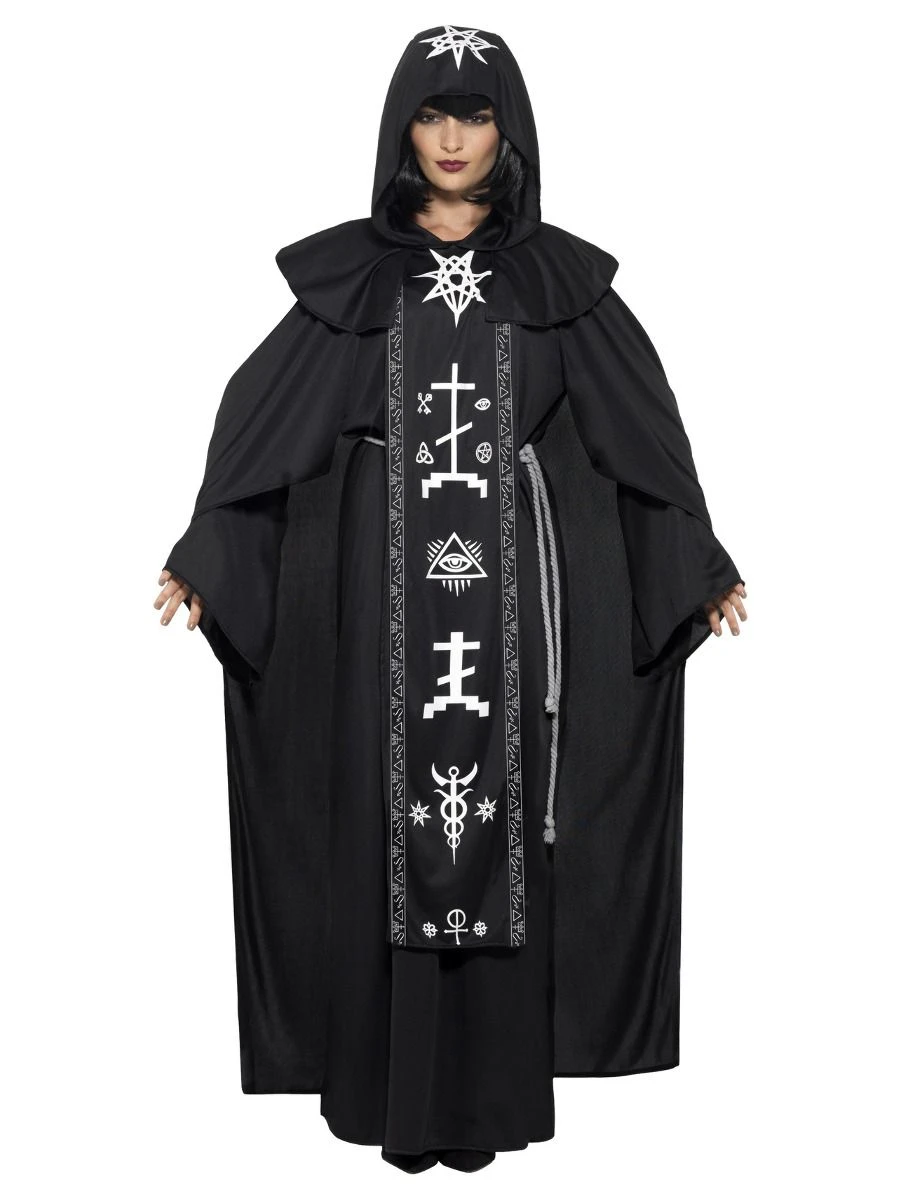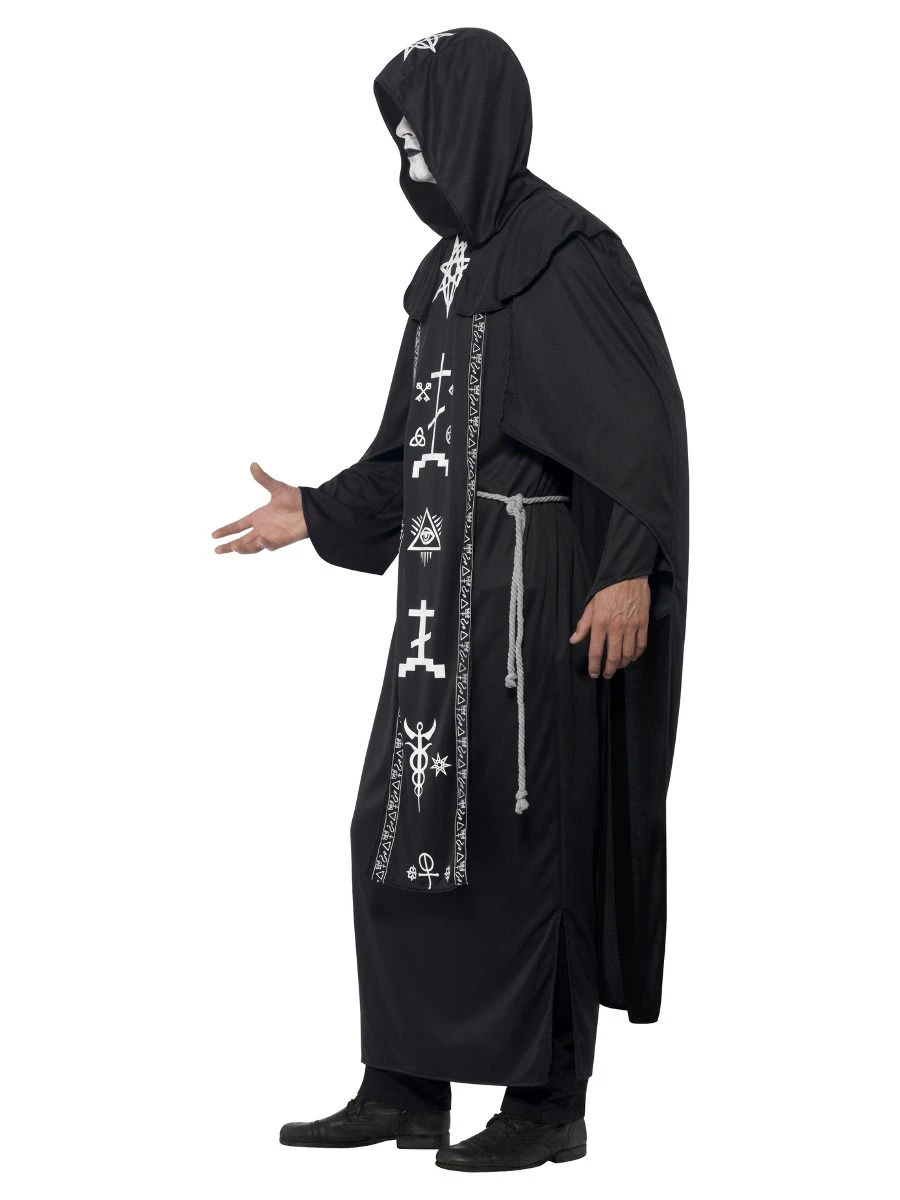 Black hooded robe with occult symbols and belt. One size fits most.