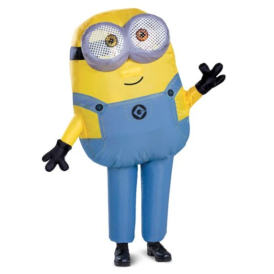Inflatable jumpsuit and battery-operated air inflating fan. This child costume is a one size fits up to a size 8.