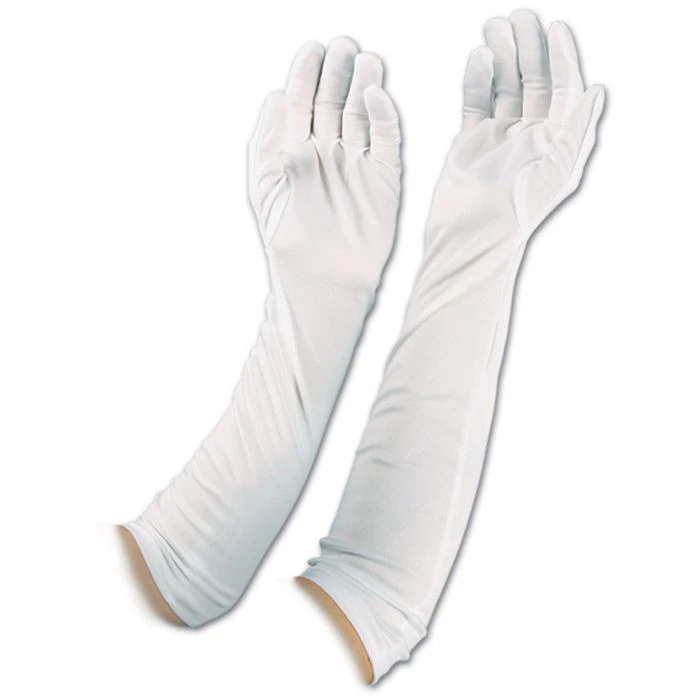 Elbow length polyester evening gloves. Available in white and black.