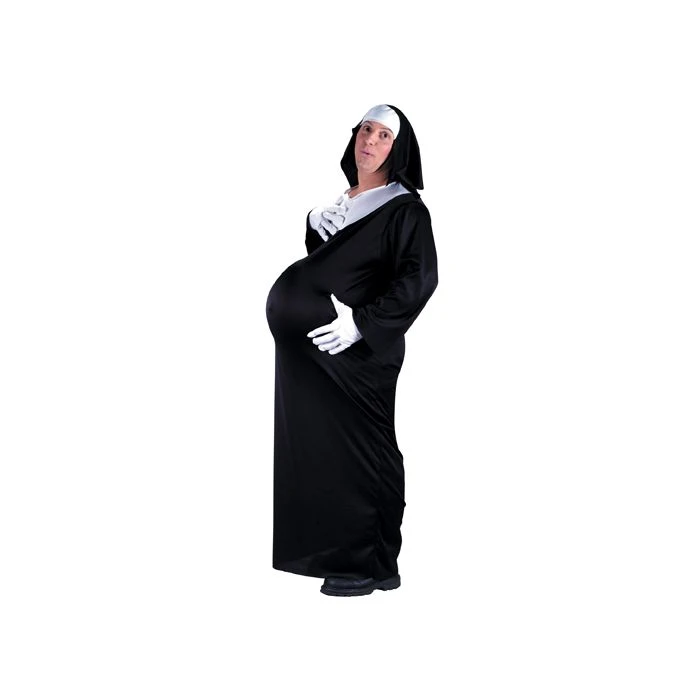 This one size fits most (Up to 6 ft 200lbs) costume includes a robe, habit, inflatable tummy and gloves.