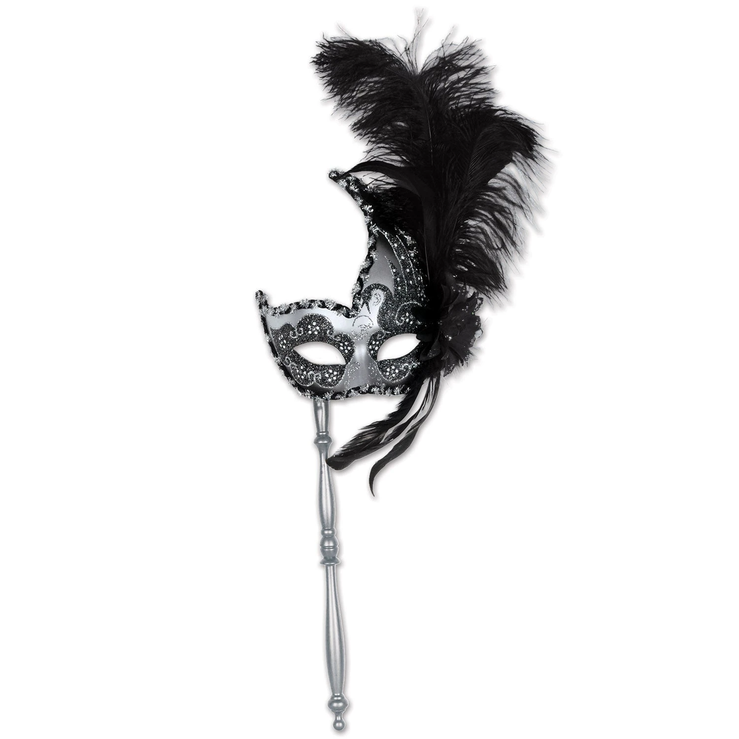This black and silver glittered eye mask on a plastic stick is made of hard plastic with glitter details, metallic trim, black plume feathers, & silk flower Mask is attached to a 12″ gold detailed stick. Very sturdy construction! One size fits most.
