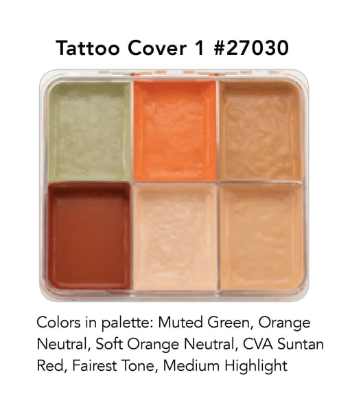 - The Tattoo Cover 1 – Light Palette includes 6 colors for skin color correction for covering tattoos, or for correcting discoloration on lighter shades of skin. These colors allow you to utilize opposite color theory to effective obscure and cancel out the tattoo or discoloration.
