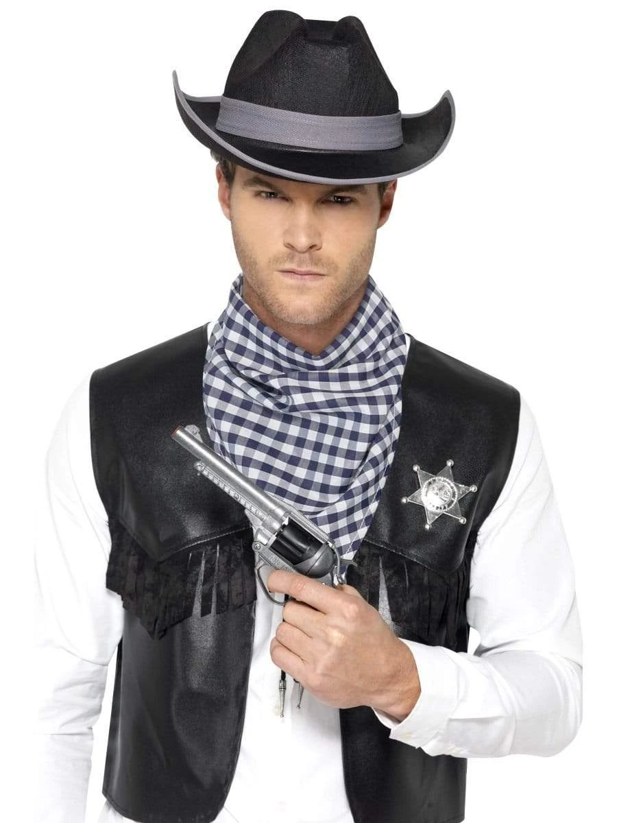 Yee Haw! This western kit includes a faux leather vest with attached sheriff badge, black cowboy hat, and neck bandana. Just add your own shirt, pants, and boots and you are all set!