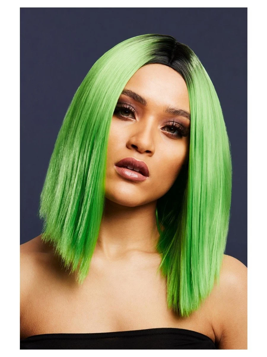 Fever Kylie Wig, Two-Toned Blend – Lime Green w/Dark Roots. Inverted Long, Straight Bob, Center Parting. 15in/37cm.