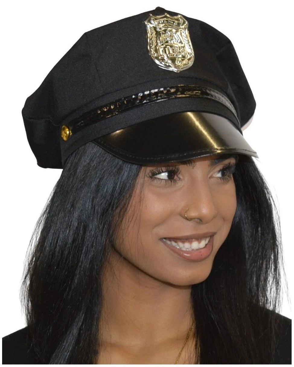 Top off your look with this stylish Police Cap. This classic cap features a sleek navy fabric with a traditional police badge. Make a statement and stay cool with this fashionable and functional accessory.