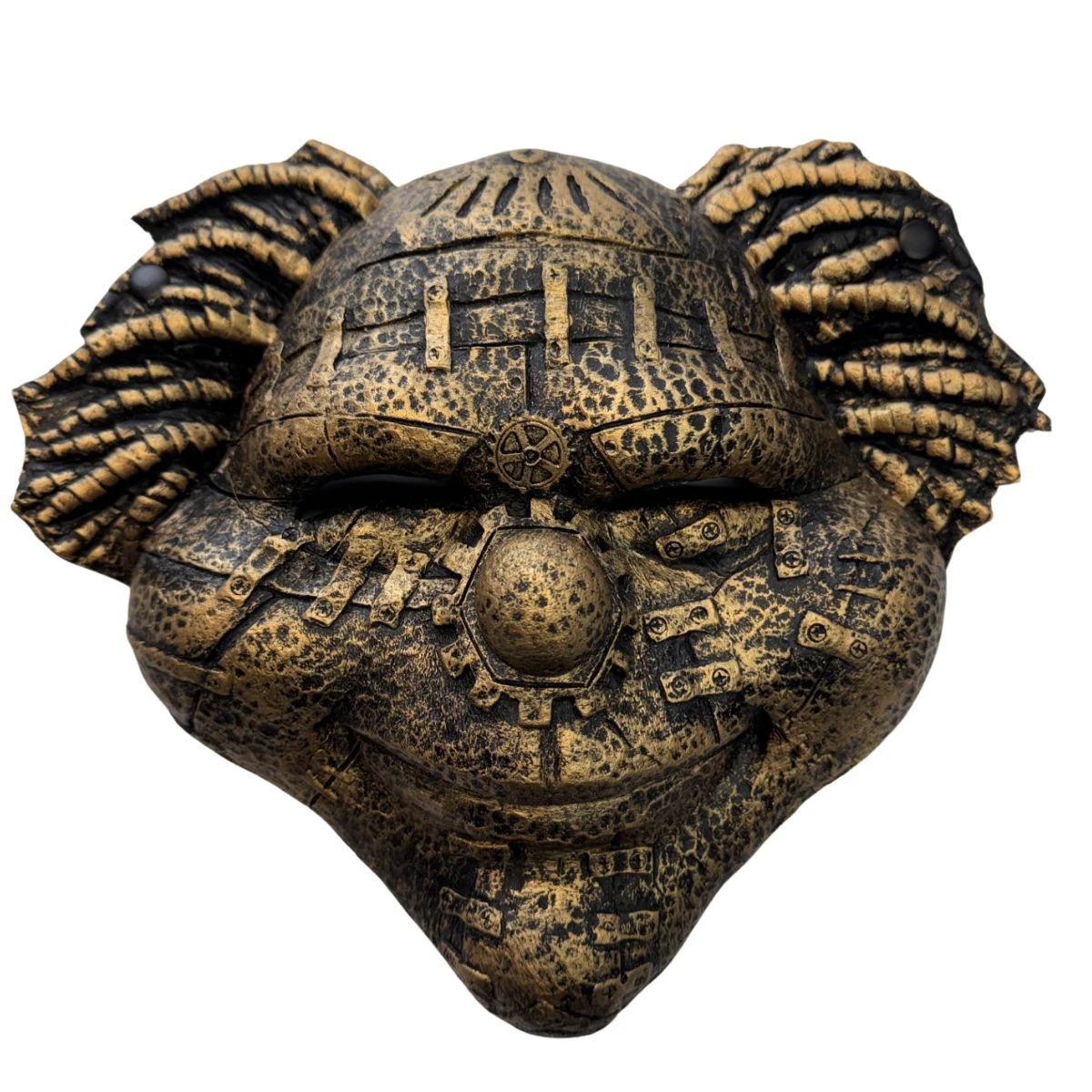 Crafted from super soft foam latex, this antique gold clown mask offers full frontal coverage for an immersive and comfortable fit. Its supple material ensures flexibility and durability, making it ideal for extended wear. Perfect for adding a chilling yet sophisticated touch to any costume, this mask combines expert craftsmanship with eerie style.