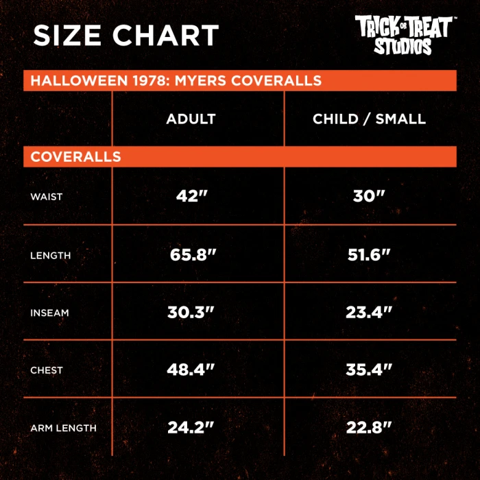 | Developed by Trick or Treat Studios Trick or Treat Studios and Compass International Picture are proud to present the Official Halloween Michael Myers Adult Coveralls! These coveralls are a beautiful version of the coveralls worn by Michael Myers in John Carpenter’s Halloween. Every pocket, every stitch, every button, every zipper from the screen-used coveralls is represented in these amazing coveralls. The Halloween Michael Myers Adult Coveralls are one size fits most, please read the size chart in the product images before ordering. Mask and knife sold separately. © 2018 Compass International Pictures, Inc., All Rights Reserved. | ![]() |