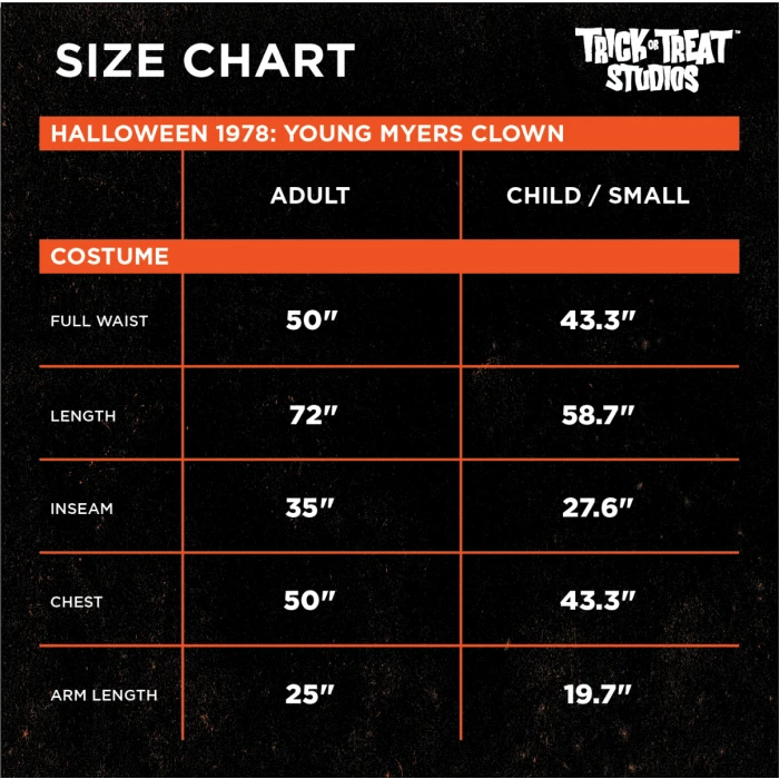 | Designed by Trick or Treat Studios Trick or Treat Studios and Compass International Pictures are proud to present the Official Halloween Young Michael Myers Clown Costume! This incredible costume is a beautiful replica of the costume worn by Young Michael Myers after killing his Sister, Judith Myers in the opening scene of John Carpenter’s Halloween. Costume includes Clown suit and Mask. Please see size chart in the product images before ordering. So get yourself The Official Halloween Young Michael Myers Clown Costume and celebrate The Night He Came Home! © 2018 Compass International Pictures, Inc., All Rights Reserved.
